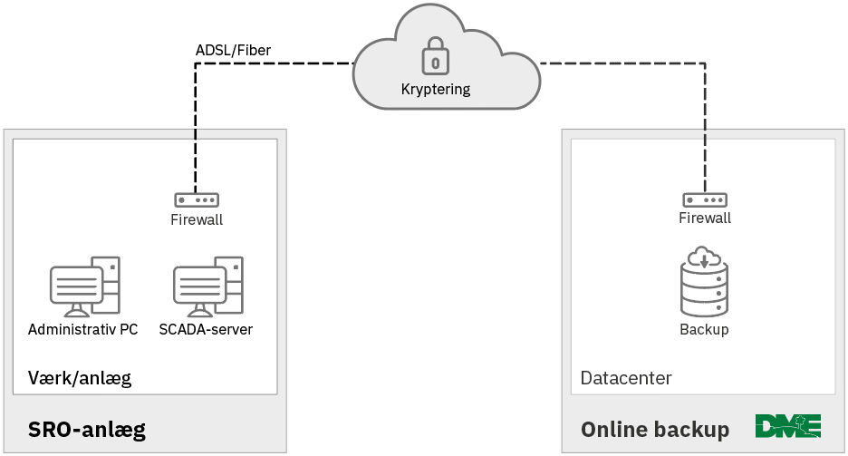 DME online backup laver automatisk en sikker, krypteret backup af dit SRO-anlæg og sender den ud af dit anlæg og ind i vores professionelle datacenter. Vi tager backup af dine data én gang i døgnet - eller oftere hvis du ønsker det. Vores datacenter er dedikeret til SRO-data og bygget til at servicere kritisk infrastruktur. Alt netværkstrafik bliver analyseret for skadelig trafik, og sikkerheden revideres af ekstern revisor gennem ISO27002.